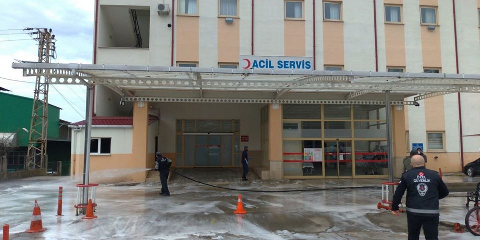 acil ve poliklinik girişi Belediyemiz ekiplerince tazyikli, köpüklü ve ilaçlı